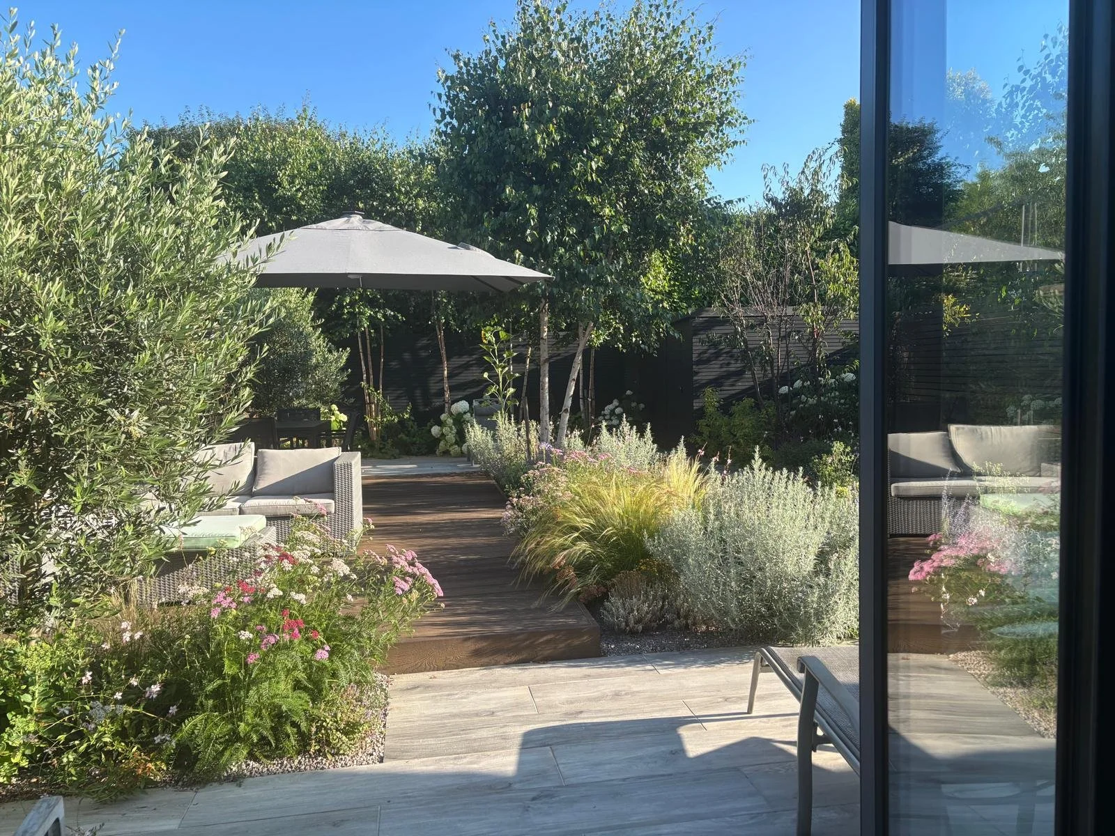 Indoor - outdoor livingThe porcelain terrace seamlessly links the inside and out. The contemporary and modern feel of the home is continued into the garden. The naturalistic planting adds the dynamism to the garden creating a beautiful, calming space for family and friends.